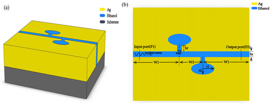 As shown in Figure 1, the schematic view of the geometric structure is depicted. The structure is composed of a waveguide layer and a substrate layer. Figure 1a is three-dimension schematic view and 1b is a two-dimension schematic view of the proposed structure. From the three-dimension geometry diagram we can see that a MIM waveguide layers were deposited on the quartz substrate which provided mechanical buffering. Figure 1b, the top view of Figure 1a, clearly shows the structure of the waveguide. Two ellipses resonators, connected to a straight waveguide by two rectangular tubes, were sandwiched between two silver layers. Our reasoning for choosing silver as metallic material was that the imaginary part of relative permittivity is smaller than most metals so it has lower energy-loss compared to other metals [16]. The sensor was easily fabricated. Firstly, a silver layer was deposited on the quartz substrate by a chemical vapor deposition method. Then, the interconnected cavity structure, composed of two elliptical resonators, a straight waveguide, and two rectangular tubes, was etched on the silver film by an electron beam etching method. Finally, ethanol was filled into the interconnected cavity structure by capillary attraction.