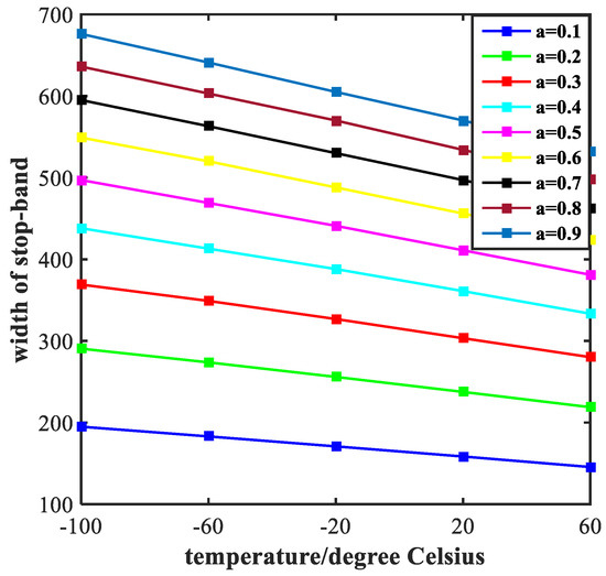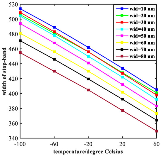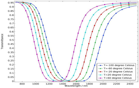The mechanism of the temperature sensor is to make use of the influence of ambient temperature on its electromagnetic characteristics and further affect its optical characteristics. Therefore, it is critical to investigate the effects of temperature on the properties of the sensor. Figure 3 shows the transmittance of the sensor for different temperatures with a = 0.5, wid = 40 nm. As the temperature increases from −100 °C to 60 °C with a step of 40 °C, the transmission spectrum displays a blue shift phenomenon and the width of the stop-band decreases. This is because, as the temperature increases, the refractive index of ethanol decreases, thereby weakening the strength of the vertical coupling. This indicates that the sensor is suitable for sensing application for low temperature.