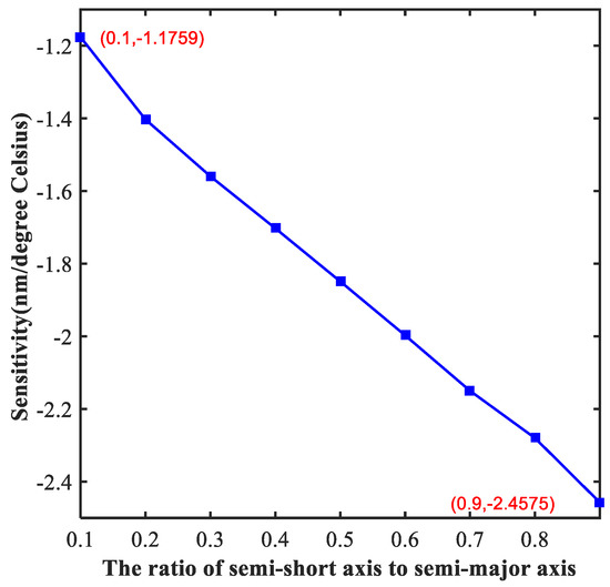 The sensitivity of the proposed sensor with different ratio of semi-short axis to semi-major axis. The maximum sensitivity of the sensor is about −2.45 nm/°C and the minimum sensitivity is about −1.17 nm/°C.