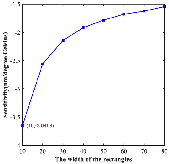 In addition, the width of two rectangular tubes (indicated by the symbol of wid) is another important parameter that affected the performance of the proposed device. We focus on the impact of the width of the two small rectangular tubes on the sensor in the following, and the distance from the middle axis of the right rectangular tubes to the right edge of the metal (indicated by the symbol of W2) was set as 300 nm. The relation between sensitivity and wid is shown in Figure 5. Unlike the linear relationship depicted in Figure 4, the functional relationship in Figure 5 is similar to a power function. It is worth mentioning that the sensitivity that we obtained is as high as −3.64 nm/°C when wid = 10 nm.
