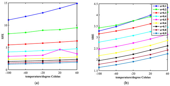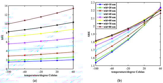 As we can see from the Figure 8, the width of stop-band tends to decline with the temperature increases, which exhibits a similar trend with lines in Figure 6. However, the difference from Figure 6 is that the curves in Figure 8 drop faster. This is because the effect of width of the rectangular tubes (indicated by the symbol of wid) on electromagnetic properties of the structure is much bigger than the ratio of semi-short axis to semi-major axis of the ellipse resonators. The curves of SRE and SFE are plotted in Figure 9. As the temperature increases, both SRE and SFE show an increasing trend. By comparing Figure 9a with Figure 9b, it can be seen that the rising edge is more affected by the width of two rectangular tubes. Moreover, the steepness of the rising edge converges to a point at the end, indicating that the width of the rising edge does not change as the width increases. In general, the performance of filtering is best when wid = 80 nm.
