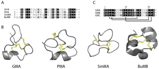 - Hill, J.M.; Alewood, P.F.; Craik, D.J. Three-dimensional solution structure of μ-conotoxin GIIIB, a specific blocker of skeletal muscle sodium channels. Biochemistry 1996, 35, 8824–8835. [Google Scholar] [CrossRef] [PubMed]