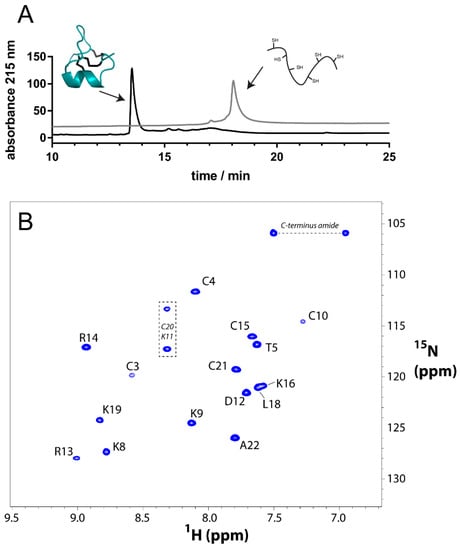 - Kuang, Z.H.; Zhang, M.M.; Gupta, K.; Gajewiak, J.; Gulyas, J.; Balaram, P.; Rivier, J.E.; Olivera, B.M.; Yoshikami, D.; Bulaj, G.; et al. Mammalian neuronal sodium channel blocker μ-conotoxin BuIIIB has a structured N-terminus that influences potency. ACS Chem. Biol. 2013, 8, 1344–1351. [Google Scholar] [CrossRef] [PubMed]