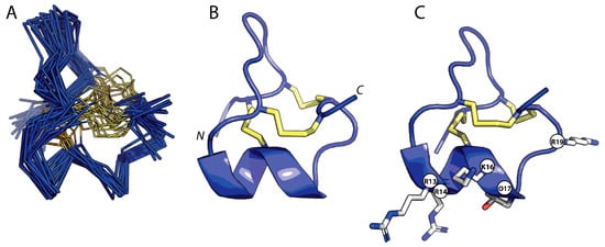 - Lancelin, J.M.; Kohda, D.; Tate, S.; Yanagawa, Y.; Abe, T.; Satake, M.; Inagaki, F. Tertiary structure of conotoxin GIIIA in aqueous-solution. Biochemistry 1991, 30, 6908–6916. [Google Scholar] [CrossRef] [PubMed]