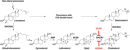- Herman, G.E.; Kratz, L. Disorders of sterol synthesis: Beyond Smith-Lemli-Opitz syndrome. Am. J. Med. Genet. C Semin. Med. Genet. 2012, 160C, 301–321. [Google Scholar] [CrossRef] [PubMed]