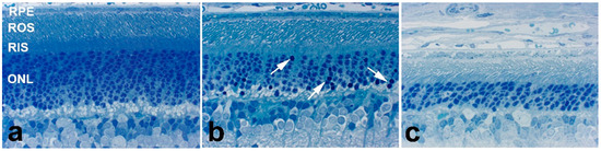 Histological degeneration of the retina observed in the AY9944-induced rat model of SLOS as a function of postnatal age at postnatal (a) one month, (b) two months, and (c) three months. Note progressive thinning of the outer nuclear layer (ONL), the appearance of pyknotic photoreceptor nuclei by two postnatal months (arrows, panel b), and the progressive shortening of rod outer segments (ROS). Epon embedment; toluidine blue stain.