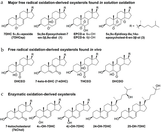 Chemical structure of some 7DHC-derived oxysterols: (a) Major oxysterols derived from free radical oxidation of 7DHC in organic solvent (benzene); (b) Oxysterols metabolites observed in biological systems that are derived from the primary oxysterols in solution; (c) Oxysterols derived from enzymatic oxidation of 7DHC by cytochrome P450 (CYP).