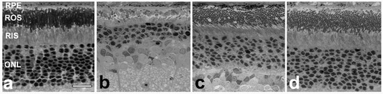 Retinal histology of normal control rat (a) and AY9944-treated (SLOS model) rats (b,c,d) as a function of dietary treatment (at postnatal three months of age). (a) Normal rat raised on standard (Chol-free) diet; (b) SLOS model rat raised on Chol-free diet; (c) SLOS model rat raised on 2%, by wt., Chol-enriched diet; (d) SLOS model rat raised on Chol-enriched diet supplemented with vitamins E and C and sodium selenite. Scale bar (panel a, for all panels), 20 μm. (Adapted from Figure 1 in [64] with permission.).
