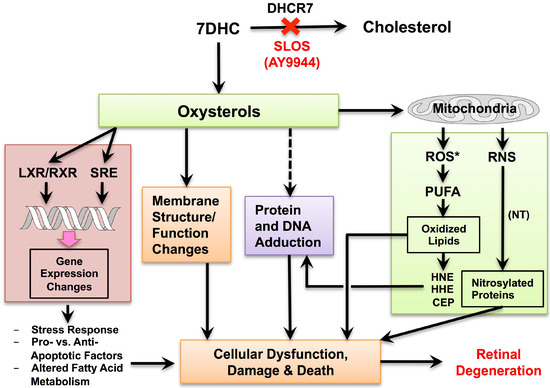 Schematic illustrating hypothetical mechanisms underlying retinal degeneration in the AY9944-induced rat model of SLOS and the therapeutic potential of antioxidants to prevent or minimize the degeneration. Abbreviations: LXR, liver X-receptor; RXR, retinoid X-receptor; SRE, sterol response elements; ROS*, reactive oxygen species; RNS*, reactive nitrogen species; HHE, 4-hydroxynonenal; HHE, 4-hydroxyhexenal; CEP, carboxyethylpyrrole; NT, nitrotyrosine; other abbreviations as described in text (Adapted from Figure 29 in [63] with permission.).