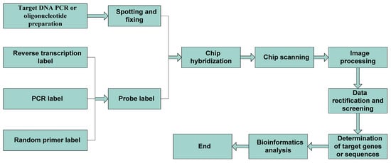 Gene chip technology is fast, highly efficient, automated, parallel, and economical. It has become an important technical method in the field of screening and the evaluation of inferior and counterfeit drugs of Chinese herbal medicine. The process involves obtaining the standard atlas of positive drugs and the atlas of prepared identification (query) drugs, and then analyzing and comparing the differences between the two. To obtain the two maps, one must first extract DNA from the corresponding samples, and then let them hybridize with DNA chips [24,25,26,27]. The detection steps of gene chip technology are shown in Figure 1.