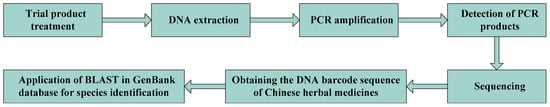 Ever since Canadian scientist Paul Herbert [40] proposed DNA barcoding technology back in 2003, this diagnostic technology has been widely used in the field of species identification. DNA barcoding uses a short, unique DNA sequence to identify a species. Since traditional Chinese medicines are derived from a variety of animals, plants, and minerals, this technology can be used for the accurate identification and evaluation of medicinal ingredients. This technique is widely used in the field of biological and medicinal material identification because it is not influenced by the morphology of the sample or the surrounding environment [41]. The application of this technology has broadened widely, and has reached multiple fields and industries, such as ecology, development, and evolution, Chinese herbal medicine identification, and genetic identification [42]. A non-trivial proportion of the public fungal DNA sequences are compromised in terms of quality and reliability, contributing noise and bias to sequence-borne inferences. R. Henrik Nilsson et al. [43] discussed various aspects and pitfalls of sequence quality assessment. Based on their observations, they provided a set of guidelines to assist in the manual quality management of newly generated, near-full-length (Sanger-derived) fungal internal transcribed spacer (ITS) sequences, and to some extent also sequences of shorter read lengths, other genes or markers, and groups of organisms. A flow chart describing the process of the DNA barcoding molecular identification of Chinese herbal medicines is shown in Figure 2.