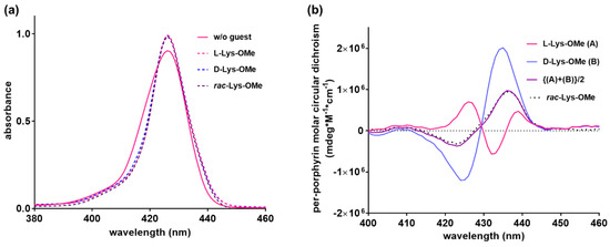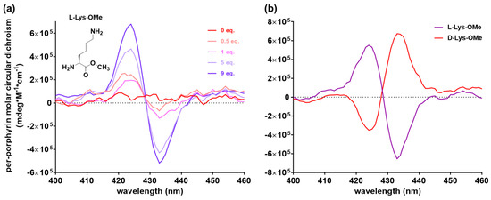 Two pigments arranged in a chiral environment exhibit ECCD [61]. Owing to the achiral peptoid scaffold, two porphyrins of 1 cannot generate an ECCD signal [14,60]. If a chiral guest is caught between the two porphyrins of 1, the intercalation of the chiral guest can induce the chiral orientation between two porphyrins, thereby generating an ECCD signal [17,18]. This type of chirality transfer from a guest to a host is called chirality induction. l- or d-Lys-OMe were used to verify that 1 can pick up one guest as a molecular tweezer, and was analyzed by CD spectroscopy (Figure 2). With the addition of l-Lys-OMe, the ECCD signal of 1 appeared, with the maximum at 425 nm and minimum at 432 nm, and it was a negative Cotton effect indicating a left-handed interaction between porphyrins (Figure 2a). In the case of d-Lys-OMe, the ECCD signal exhibited a mirror image that indicates d-Lys-OMe inducing a right-handed orientation of porphyrins (Figure 2b).
