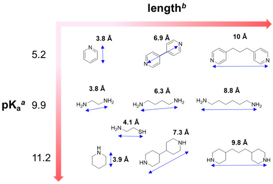 Guest molecules containing nitrogen atom(s). a The pKa values of pyridine [62], ethylenediamine [63], and piperidine [64] are shown on the left side of Figure. b The lengths of the molecules were computationally measured from nitrogen atom to nitrogen (or sulfur) atom for bidentate ligands and from nitrogen to hydrogen atom for pyridine and piperidine after energy minimization using the MM2 force field in Chem3D 16.0.