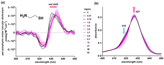 Cysteamine with one amino group exhibited a Kd of 9.5 × 10−7 M, which was similar to the value of ethylenediamine. We conclude that the thiol of cysteamine also binds to the zinc porphyrin of 2. CD and UV-vis spectra with cysteamine demonstrated distinguishable CD profiles (Figure 5), compared to other spectra with nitrogen containing guests (Figure S3). As the equivalents of cysteamine increased, the CD maxima were shifted from 430 nm to 435 nm, and the spectrum intensity was increased. This difference can be considered as a sulfur binding effect on the porphyrin tweezer. We expect MPPCs to be applied as a sensor platform for thiol containing molecules.