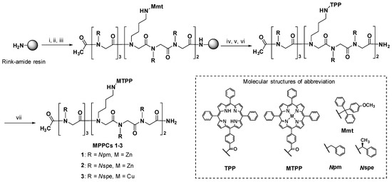 Three MPPCs of different peptoid backbones (achiral peptoid backbone with benzylamine, Npm and right-handed helix with (S)-(−)-1-phenylethylamine, Nspe) [31,60] and different metal ions were synthesized (Scheme 1). The peptoid sequence was synthesized following the standard solid-phase submonomer synthesis protocol [35], and tetraphenylporphyrins (TPPs) were conjugated on the resin-bound peptoid employing the method (Scheme 1) reported previously [14,15]. Metal incorporation on the porphyrin ring was performed with zinc acetate or copper acetate in a methanol/dichloromethane mixture. The excess metal salt was removed using an SPE cartridge (see experimental for the detailed procedures). After the removal of excess metal salts, each MPPC of purity exceeding 98% was analyzed by LC-MS based on the chromatogram integration by UV detection at 220 nm (Figure S1).