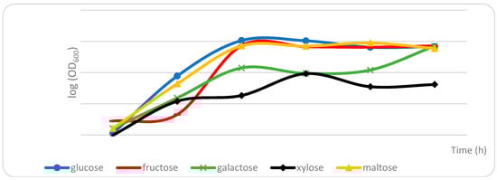Growth curves of S. fibuligera KJJ81 cultivated in different types of media containing different carbon sources such as glucose, fructose, galactose, xylose, and maltose.