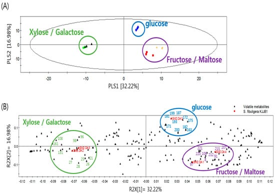 PLS-DA score plot (A) and loading plot (B) obtained from GC-MS data for volatile metabolites in the extracts of S. fibuligera KJJ81 cultivated in media containing different carbohydrates.