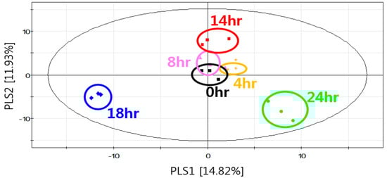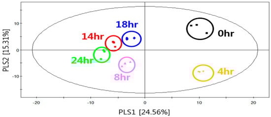 PLS-DA score plot for the nonvolatile metabolites of of S. fibuligera KJJ81 in YPD medium according to the cultivation time.