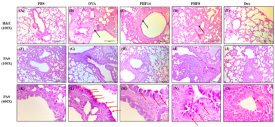 Airway wall remodeling is part of the pathogeneses of airway inflammation in allergic asthma. Representative H & E staining of the mouse lung (100×) showed smooth muscle hypertrophy in the airway of OVA control mice (Figure 1B), while the smooth muscle thickness was reduced in the 14-day PHF-treated group as depicted by the black arrows in Figure 1C. Although the thickening of the sub-epithelial basement membrane was not observed across the groups (Figure 1F–J), the distribution of the mucus-secreting goblet cells in the mouse lung, as depicted by the red arrows, demonstrated that goblet cell hyperplasia was improved in the PHF-treated groups as compared to the OVA control group (Figure 1K–O). Differences in angiogenesis across the groups were not observed. PHF treatment could relieve airway remodeling, as summarized in Table 1, however, its effects were not as prominent as the dexamethasone positive control group.