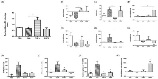 PHF treatment induced changes in the overall microbial community structure in the gut. At the phylum level, the gut of the OVA control mice was dominated by butyrate-producing Firmicutes on day 24 (Figure 4A). However, upon PHF treatment for 14 days, the Bacteroidetes became the dominating group in the gut, as revealed by the significant increase in Bacteroidetes/Firmicutes ratio (p < 0.05, Figure 4A). Of note, the relative abundance of Bacteroidetes (Figure 4B) and Saccharibacteria (Figure 4D) were significantly increased in the PHF-treated mice for 14 days and 8 days, respectively, when compared to the OVA control (all p < 0.01). The abundance of Firmicutes, however, was significantly reduced upon the 14-day PHF treatment (Figure 4C). Upon 14-day PHF treatment, the other major phyla, including the Proteobacteria, Deferribacteres and Cyanobacteria, each showed a restoring trend in their relative abundance to the level comparable to their healthy counterparts, although not statistically significant (Figure 4E–G).