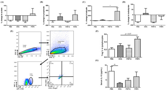 Effects of PHF treatment on short chain fatty acids (SCFAs) content in stool, modulation on the CD4+CD25highFoxp3+ Treg cells population and systemic IL-10 level of allergic asthmatic mice. Stool samples were collected on day 1 before sensitization and on day 24 before sacrifice. GC-MS quantification was performed to evaluate the concentration of SCFAs in the stool samples. Percentage changes of (A) acetate, (B) propionate, (C) butyrate and (D) isobutyrate between day 1 and day 24 are shown in bar charts with mean + SEM. (n = 3–5). (E) Gating strategy of the splenic CD4+CD25highFoxp3+ Treg cells was shown by representative dot-plots using flow cytometry. (F) Population of splenic CD4+CD25highFoxp3+ Treg cells in the lymphocytes was determined by flow cytometry. (G) The serum level of IL-10 was measured by Bio-plex pro assay. Results were shown in bar charts with mean + SEM (n = 4–8). * p < 0.05, when compared with the OVA control group. PBS: healthy control; OVA: OVA-induced allergic asthmatic control; PHF14: mice with 14-day PHF treatment; PHF8: mice with 8-day PHF treatment.