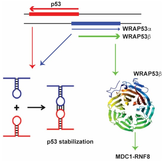 Antisense lncRNA transcripts of p53 that overlap with the first p53 exon are called WRAP53α [135] and those that overlap with the first intron are called WRAP53γ. The WRAP53α RNA directly interacts with the p53 mRNA via RNA-RNA interactions to affect p53 protein levels [135]. WRAP53 an interesting example of gene that encodes both a lncRNA and is also transcribed into the protein WRAP53β (also known as WDR79 or TCAB1) [136,137,138] WRAP53β has multiple functions in the cell one of which is to target RNF8 to DNA double-strand breaks. Therefore both the protein, as well as the lncRNA is involved in the DNA damage response, albeit through different mechanisms.