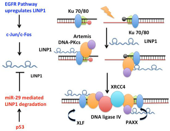 The long non-coding RNA “lncRNA in non-homologous end joining pathway” LINP1 [106,139,140] forms an RNA scaffold that, at least in cell extracts, interacts with both Ku70–Ku80 and DNA-PKcs on chromatin to promote end joining (Figure 2). LINP1 is overexpressed in triple negative breast cancer (TNBC) tumors, in the TNBC cell lines MDA-MB-231 and MDA-MB-468, and in triple-negative immortalized mammary cells MCF10A. LINP1 is not detected in ER-positive MCF7 cells. NHEJ reporter assays show that knockdown of LINP1 in TNBC cells decreases NHEJ and overexpression of LINP1 in MCF7 cells increases NHEJ activity [106]. Knockdown of LINP1 also sensitizes mice to ionizing radiation due to defects in DNA repair via the NHEJ pathway. Activation of EGFR signaling via MEK and JNK kinases up regulates LINP1 whereas tumor suppressor p53 represses LINP1 via the microRNA miR-29. Recent studies show that LINP1 levels are also increased in cervical cancer [141] as well as advanced prostate cancer [139] and are correlated with poor prognosis.