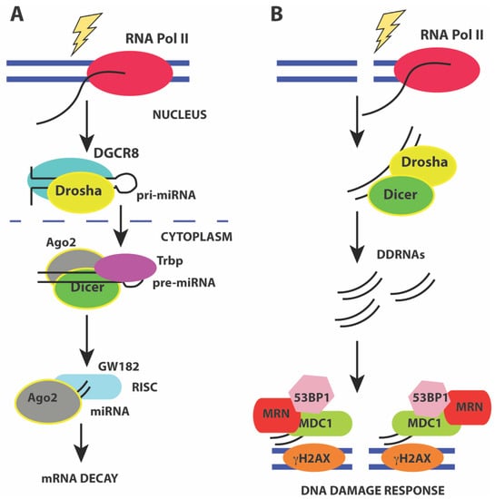 (A) pathway of miRNA processing to regulate mRNA decay. Pri-miRNA precursors are transcribed and processed before assembling into a macromolecular complex containing the Drosha/DGCR8 heterodimer to release a ~70 nt pre-miRNA hairpin in the nucleus. The pre-miRNA hairpin is exported to the cytoplasm by XPO5 and Ran-GTP. In the cytoplasm, the pre-miRNA hairpin is cleaved by Dicer to generate the mature ~22 nt miRNA duplex that associates with Ago2 leading to the formation of the RNA-induced silencing complex (RISC). Activation of mRNA decay results in base-pairing of the guide strand to the mRNA 3’ UTR and recruitment of mRNA decay factors such as GW182; (B) Activation of the DNA damage response by DDRNAs also involves miRNA processing factors Drosha and Dicer that are required to generate small ~20–35 nt RNAs from the sequences around the site of damage. Formation of DNA damage foci and recruitment of DNA damage factors requires DDRNAs, Drosha, and Dicer.