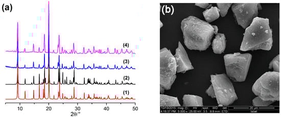 (a) Powder X-ray diffraction (PXRD) patterns of [Co(l-tyr)]n(l-tyrCo): (1) simulated from single crystal X-ray diffraction data, (2) as-synthesized, (3) after the experiment, (4) after soaking in a large volume of methanol and n-hexane/isopropanol (70/30, v/v) for 48 h; (b) SEM image of the selected [Co(l-tyr)]n(l-tyrCo) particles.
