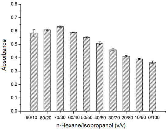 The sample solvent composition will influence adsorption of the analyte on SPE adsorbent. In this study, (±)-1,1′-bi-2-naphthol was dissolved in mixtures of n-hexane/isopropanol mixtures at different ratios (90/10, 80/20, 70/30, 60/40, 50/50, 40/60, 30/70, 20/80, 10/90, and 0/100; v/v). As can be seen in Figure 4, the maximum absorbance of the eluate was obtained when using n-hexane/isopropanol = 70/30 (v/v) as solvent. This solvent mixture was therefore chosen for the following experiments.