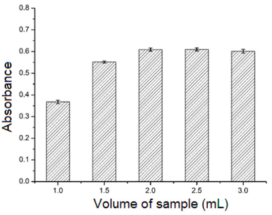 The adsorption efficiency can also be influenced by the volume of the sample solution. Volumes of sample solution (3 mmol L−1) in the range of 1.0–3.0 mL were passed through the SPE cartridge, and the adsorbed analytes were eluted with methanol (4 mL). As shown in Figure 5, the absorbance of the eluate increased as the sample solution volume was increased from 1.0 mL to 2.0 mL, but remained stable as the volume was increased to 3.0 mL. Thus, the optimum volume was 2.0 mL.