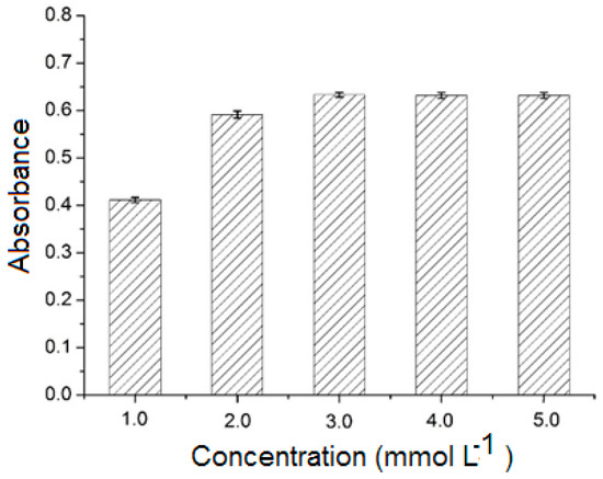 Five different concentrations (1.0, 2.0, 3.0, 4.0, and 5.0 mmol L−1) of (±)-1,1′-bi-2-naphthol were investigated. As shown in Figure 6, the absorbance of the eluate increased as the analyte concentration was increased from 1.0 to 3.0 mmol L−1, with no further increase as the concentration was raised to 5.0 mmol L−1. The optimal concentration was therefore 3.0 mmol L−1.