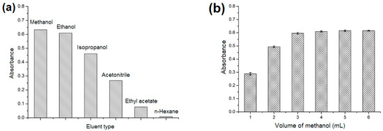 The nature of the elution solvent plays an important role in the effective desorption of analyte from adsorbent. The influence of elution solvent on desorption was evaluated under the optimum conditions using six common organic solvents: Methanol, Ethanol, Isopropanol, Acetonitrile, Ethyl acetate, and n-Hexane. As shown in Figure 7a, the maximum absorbance of the eluate was obtained when using methanol as the desorption solvent. Therefore, methanol was adopted as the optimal desorption solvent. The volume of methanol was also optimized because the sorption analyte cannot be completely eluted by a small amount of methanol, and long volatilization time will be taken when excessive methanol is used. As presented in Figure 7b, the absorbance of the eluate increased as the volume of methanol was increased from 1 to 4 mL, and no significant changes were observed as the volume was increased further. Consequently, 4 mL of methanol was sufficient for the analytes to be completely eluted and was chosen as the optimized volume.