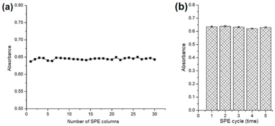 To evaluate the reproducibility of the SPE column, the sample solution (3 mmol L−1, 2 mL) was added to each of 30 SPE cartridges filled with different batches of [Co(l-tyr)]n(l-tyrCo) particles. As shown in Figure 8a, the differences in the absorbance values of the eluates among the 30 columns were very small, indicating the good reproducibility of the SPE column. The reusability of the SPE column was also investigated. After each SPE experiment, the column was washed sequentially with methanol (10 mL) and n-hexane/isopropanol (70/30, v/v, 10 mL), and then reused for the next extraction cycle. As presented in Figure 8b, no obvious change in absorbance of the eluate was observed after five SPE cycles, indicating good reusability of the SPE column.