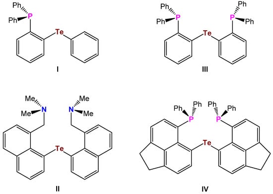 - Gysling, H.J.; Luss, H.R. Synthesis and properties of the hybrid tellurium-phosphorus ligand phenyl o-(diphenylphosphino)phenyl telluride. X-ray structure of [Pt[PhTe(o-(PPh2C6H4)]2][Pt(SCN)4]·2DMF. Organometallics 1984, 3, 596–598. [Google Scholar] [CrossRef]
