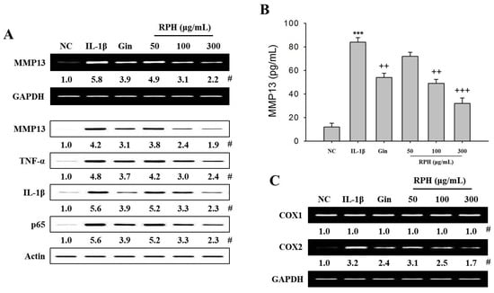 The OA joints when stimulated by IL-1β, produce high levels of a variety of MMPs, particularly MMP13 [21,22]. Thus, we examined whether RPH has any influence on the expression of various molecules (MMP13, TNF-α, IL-1β, IκBα, and COX1/2) related to cartilage degradation and inflammation of OA in IL-1β-stimulated SW1353 cells. Expression of MMP13 mRNA and protein, and the amount of MMP13 secreted was increased in IL-1β-stimulated SW1353 cells versus negative control (NC). RPH pretreatment (50, 100, 300 μg/mL) reduced the expression of MMP13 in a dose-dependent manner (Figure 1A).