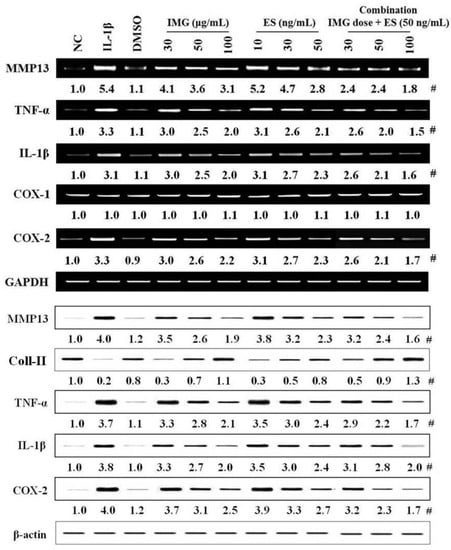 Effects of single component IMG and ES isolated from natural product mixture (RPH) on the expression of OA-related molecules in IL-1β-stimulated SW1353 cells. SW1353 cells (1 × 106 cells) were stimulated with 20 μg/mL IL-1β for 24 h. IMG (isomucronulatol 7-β-O-glucoside, 30, 50 or 100 μg/mL), ES (ecliptasaponin A, 10, 30 or 50 ng/mL), or combination (each dose of IMG + 50 ng/mL ES) was pretreated at 1 h before IL-1β stimulation. The expression of OA-related molecules including collagen type II was determined in mRNA extracts isolated the cell lysates using RT-PCR, and Western blot, respectively. (Upper panel) The mRNA expression of OA-related molecules (MMP13, TNF-α, IL-1β, COX1/2). (Lower panel) The protein expression of OA-related molecules (MMP13, Collagen type II, TNF-α, IL-1β, and COX-2). #, Numbers below band images are the mean values (n = 4) obtained from as described in the Figure 1 legend. NC, negative control; IL-1β (interleukin 1 beta), IL-1β-stimulated SW1353 cells; DMSO (0.3%), control for the solvent of a single component; Coll-II, collagen type II.