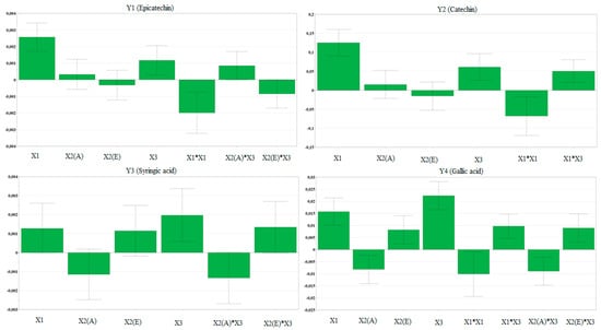 Influence of working conditions on the bioactive compounds recovery from walnut septum extracts, presented as scaled and centered coefficient plots. X1—temperature (°C); X2(A)—solvent type (acetone), X2(E)—solvent type (ethanol); X3—water % in mixture with solvent; Y1, Y2, Y3, Y4, Y5, Y6, Y7, Y8, Y9, Y10, Y11—dependent variables (bioactive compounds) according to Table 5.