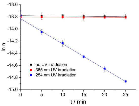 The change of natural logarithm of RPE moles with time under no UV irradiation, 365 nm and 254 nm UV irradiation at 40 °C.