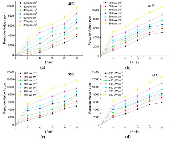 Figure 4 showed that PV rose with the increasing in light intensity and reaction temperature. These results revealed that UV irradiation induced oxidation of RPE which then led to the formation of more peroxides. The unsaturated bonds in RPE molecular structures were oxidized to form peroxides under UV irradiation, and the formation rates of peroxides and free radicals (R) during the reaction were critical to the photo-oxidation [25]. Peroxide formation thus contributed toward potent off-flavors and had a direct impact on the quality of many RPE products. Therefore, it is necessary to prevent RPE from exposure to UV light or add in light stabilizers in RPE usage.