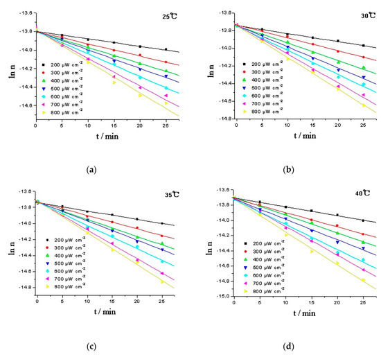 The logarithm of moles (ln n) was plotted against time (t), and the moles of RPE was calculated from the working curve of RPE, y = 1.309 × 103x − 0.363, and oxide of RPE, y = 16.654 × 103x + 0.0256. The linear response of ln n to time suggests that the oxidation of RPE is a pseudo first-order reaction. Intensity of the irradiation is an important factor that influencing the photoactivity of organic chemicals [26]. In daily disinfection, the intensity at one meter under 254 nm UV lamp should be above 180 μW cm−2 [27]. Hence, the kinetics of the RPE photo-oxidation process were studied in a temperature range of 25–40 °C and a light intensity range of 200–800 μW cm−2 (Figure 5). Using the Levenberg-Marquardt method and employing the Matlab software package to calculate the rate constants, and the activation energies (Ea) can be estimated using the Arrhenius equation (Equation (1)) [28]. The results are given in Table 1.
