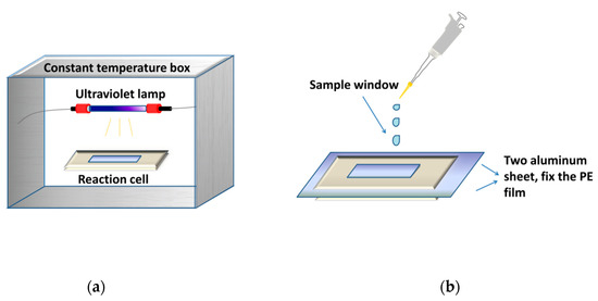 All experiments were carried out in the photoreactor described above. RPE (0.35 g) was dissolved in acetone (5 mL). Then, 20 μL of as-prepared solution was measured and added dropwise to photoreactor. After the solvent was fully evaporated in vacuum at 20 °C, the sample formed a thin film with a film area of 5.1 cm2. The testing sample was exposed to the UV irradiance beam, and the photo-oxidation of RPE was conducted by UV on its film surface. The kinetic runs were then performed at 25 °C to 40 °C. The photoreactor (as a reactor and a sample cell) was then placed into the UV spectrophotometer (Agilent-8453E, Agilent Technologies Co., Ltd., Santa Clara, CA, USA) every 5 min for quantitative analysis of RPE by external standard method.