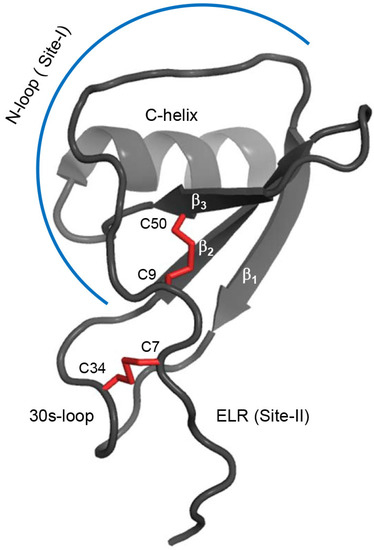 A schematic of the CXCL8 monomer (PDB ID: 5WDZ) showing the different secondary structural elements and the receptor binding sites (Site-1 and Site-II). The disulfide bonds are shown as red sticks.