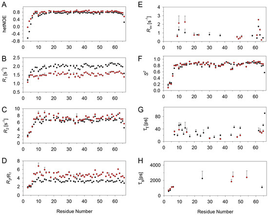 Several studies have reported that small Rex terms obtained from fitting the relaxation experimental data to Lipari–Szabo model-free approach must be interpreted with caution, as they may reflect anisotropy of overall tumbling or data fitting artifacts, and are best validated using CPMG relaxation dispersion experiments tailored to detect ms–μs dynamics [48,49,50,51,52,53]. Indeed, CPMG relaxation dispersion data indicate ms–μs dynamics only for V62 and K23 (only at 800 MHz) (Figure 5). Dispersion data for K23 fit to a two-state exchange model with kex >> δω, and for V62 to a two-state exchange model with kex << δω.