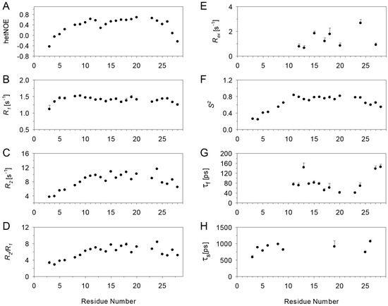 - Lipari, G.; Szabo, A. Model-Free Approach to the Interpretation of Nuclear Magnetic Resonance Relaxation in Macromolecules. 2. Analysis of Experimental Results. J. Am. Chem. Soc. 1982, 104, 4559–4570. [Google Scholar] [CrossRef]