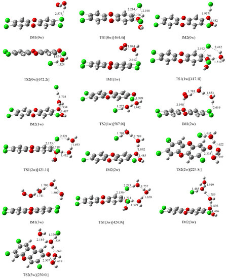 As displayed in Figure 2 and Figure S1, TCDD, H2O2, and H2O interact with each other via intermolecular H-bonds in the formed IMs, which can be confirmed by the presence of the corresponding BCPs. In IM1(0w), one of the H atoms of H2O2 forms an intermolecular H-bond with the chlorine atom of TCDD. For the water molecules introduced, they interact with both TCDD and H2O2 simultaneously via intermolecular H-bonds. As presented in Table S1, the above intermolecular H-bonds are mostly predominated by the electrostatic interactions as can be seen from the positive values of the ∇2ρbcp and Hbcp of the electron density at the BCPs. Actually, this point is also be reflected by the large H-bonding distances shown in Figure 2.