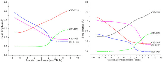 Variations of the selected bond lengths along with the IRC of the transition states TS1(0w) (left) and TS1(1w) (right).