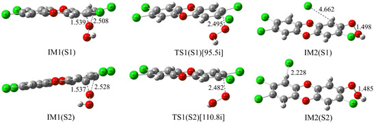 As shown in Figure 4, two different nucleophilic attack modes, i.e., modes S1 and S2, have been designed based on the structural symmetry of TCDD. Similar to the above reaction involving neutral H2O2, two initial intermediates IM1(S1) and IM1(S2) for the two modes have first been located. Subsequently, the nucleophilic attack of HO2− on TCDD occurs via transition states TS1(S1) and TS1(S2), leading to the production of the second intermediates IM2(S1) and IM2(S2) containing an O-O bond. As expected, the following process should proceed to produce radicals via the homolytic cleavage of the O-O bond. Especially, unlike the reaction of the neutral H2O2 mentioned above, no explicit water molecules are required here.