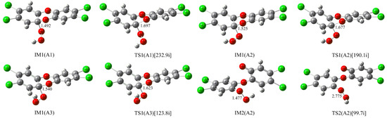 Similar to the reaction between chlorinated benzoquinones and H2O2 [33,34], the reaction between H2O2 and TCDD is initiated by the formation of an initial intermediate. Then, nucleophilic attack of H2O2 on TCDD occurs to produce an unstable intermediate containing an O-O bond. Finally, the unstable intermediate decomposes via the homolytical cleavage of the O-O bond, resulting in the production of radicals. The detailed reaction mechanisms are described as follows.