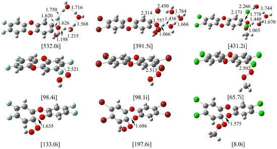 As for the above nucleophilic substitution reactions involving the anion of organic hydroperoxides, taking model S1 for example, the corresponding transition states have been given in Figure 6. For the reactions of HO2− with F- and Br- substituted TCDD, the calculated free energy barriers are higher by 1.32 and 0.27 kcal/mol than the reaction before substitution. Similarly, for the reaction of the CH3− substituted HO2− with TCDD, the calculated free energy barrier is higher by about 3.13 kcal/mol than the reaction before substitution. Therefore, it is also feasible for the reaction to take place between the anions of the organic hydroperoxides and TCDD as well as its derivatives.